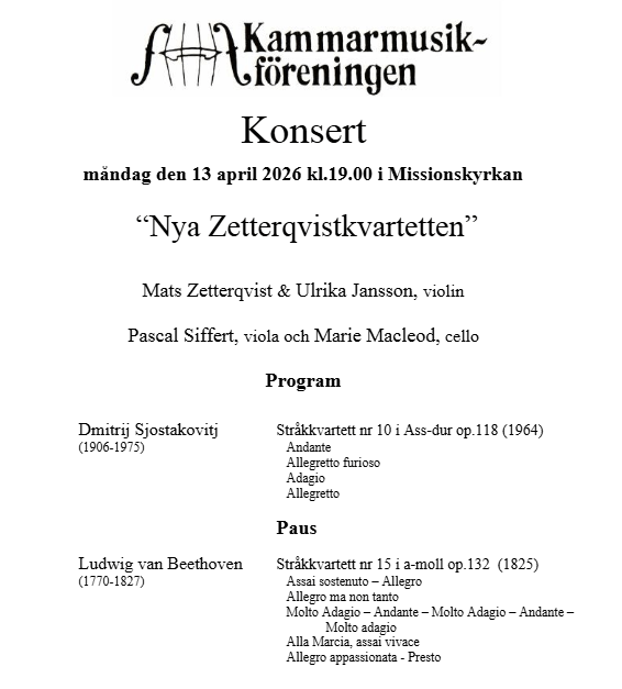 13 / 4 – Lunes: Concierto en Upps. org. por la Asociacion de Música de Cámara: Los amigos de siempre: Nils (de las patillas faciales), Anders y Barbro, Beng y Kaj, Tollef y